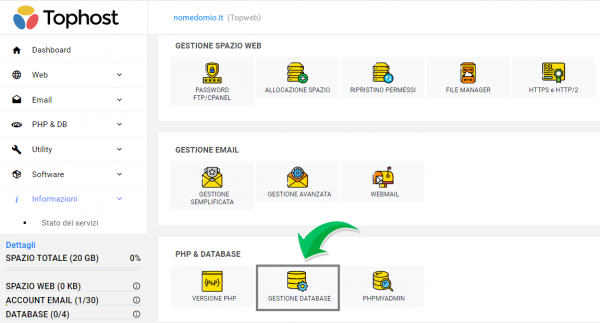 1. Se non l’hai già fatto, accedi al pannello di controllo Tophost e clicca su “Gestione Database” sotto la sezione “PHP e Database”