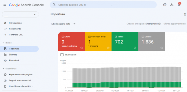 Nella sezione Coverage/Copertura della Search Console potrai visualizzare un report in cui sono riportati gli errori 300,400 e 500 del tuo sito web al momento. Le pagine verranno divise in 4 categorie: pagine con errori, pagine valide con avvertenze, pagine valide, pagine escluse dall’indice.